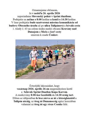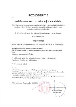 Z dôvodu konania športového podujatia Slovenský pohár v šprint duatlone dňa 26. apríla 2026, sa povoľuje dočasné uzavretie miestnych komunikácií a ciest v čase od 08:00 do 14:30