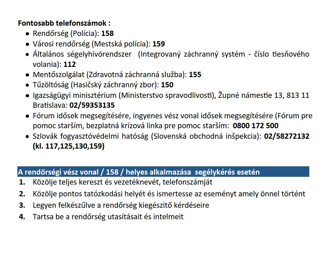 Dôležité kontakty - Fontosabb telefonszámok